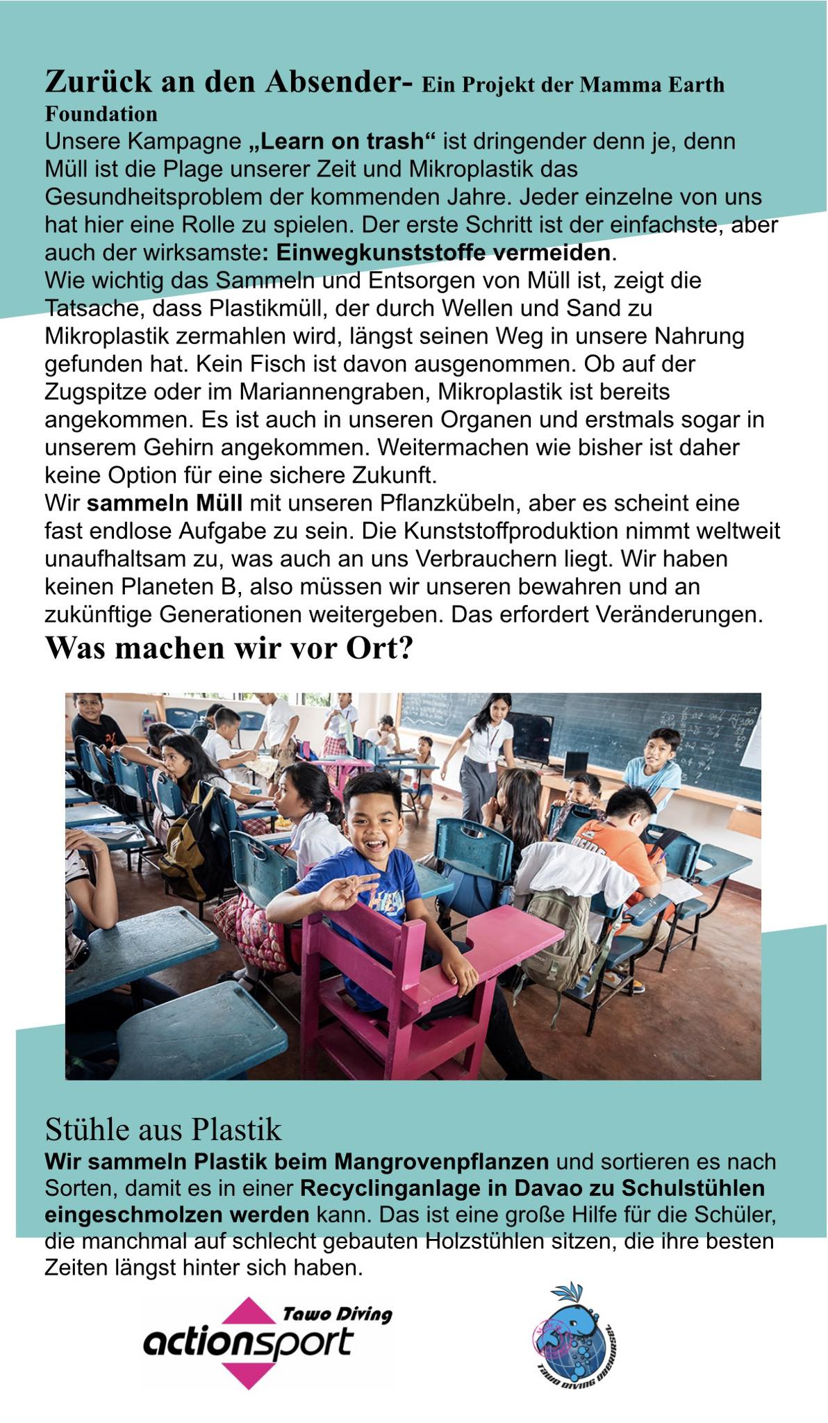Für 874€ können wir die Herstellung von 23 Schulstühlen ermöglichen, für die ca.276kg Plastikmüll gesammelt werden.